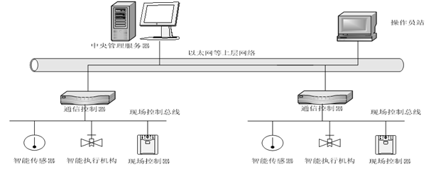 网络结构在以太网等上层网路与现场控制总线之间又增加了一层中间层控制网络,这层网络在通信速率、抗干扰能力等方面的性能都介于以太网等上层网路与底层现场控制总线之间。通过这层网络实现大型通用功能现场控制设备之间的互连。监控点分散,联动功能复杂场合。