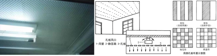 实际上是一块开有大量小孔(孔径一般为6-8mm)的平板,材料为镀锌钢板、硬质塑料板、铝板、铝合金板或不锈钢板,通常与空调房间的顶棚合为一体,既是送风口,又是顶棚。