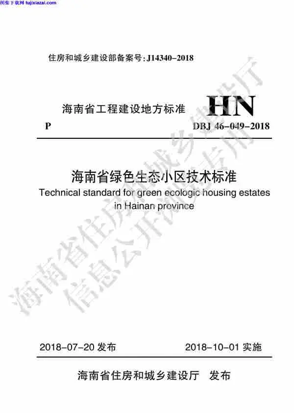为建设与自然生态环境相协调、资源节约的居住环境,实现海南省住宅产业的可持续发展,我厅委托有关单位编制了《海南省绿色生态小区技术标准》,经专家评审通过,现批准为海南省工程建设地方标准,编号为 DBJ 46-049-2018,自 2018 年 10 月 1 日起实施。