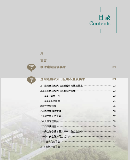 目录 Contents 序 前言 PART 临时建筑搭设要求…………………………………… 01 1 PART 进站道路和大门区域布置及要求…………………… 03 2 2.1进站道路和大门区域整体布置及要求 ………………………………03 2.2 进站道路和大门区域图牌设置 ………………………………………03 2.2.1四牌一图 ………………………………………………………03 2.2.2其他图牌 ………………………………………………………04 2.3方位指示牌 ……………………………………………………………05 2.4限速禁鸣标志牌 ………………………………………………………06 2.5施工区大门设置 ………………………………………………………07 2.6人员管理系统 …………………………………………………………08 2.7门卫值班室 ……………………………………………………………09 2.8安全语音提示器及噪声、防尘监测器 ………………………………10 2.9个人安全防护用品指示牌 ……………………………………………12 2.10技术交底平台 ………………………………………………………13 2.11车辆冲洗平台 ………………………………………………………14 PART 办公区域布置及要求………………………………… 15 3 3.1办公区整体布置要求 …………………………………………………15 3.2会议室 …………………………………………………………………20 3.3办公室 …………………………………………………………………23 3.4党员活动室 ……………………………………………………………28 3.5停车场 …………………………………………………………………29 3.6水冲式厕所 ……………………………………………………………30 PART 4 生活区域布置及要求………………………………… 31 4.1生活区整体布置要求 …………………………………………………31 4.2宿舍区 …………………………………………………………………34 4.3活动室 …………………………………………………………………37 4.4厨房、食堂区 …………………………………………………………38 4.5厕所、盥洗室、浴室区 ………………………………………………40 4.6晾晒区 …………………………………………………………………42 PART 生产加工区域布置及要求…………………………… 43 5 5.1.加工区整体布置要求 …………………………………………………43 5.2材料机具库房 …………………………………………………………44 5.3危险品仓库 ……………………………………………………………47 5.4砂石堆放场地 …………………………………………………………48 5.6钢筋加工区 ……………………………………………………………50 5.7焊接加工区 ……………………………………………………………52 5.8混凝土搅拌站及水泥仓库 ……………………………………………53 PART 6 施工区域布置及要求………………………………… 55 6.1施工现场区域划分布置 ………………………………………………55 6.2安全隔离 ………………………………………………………………57