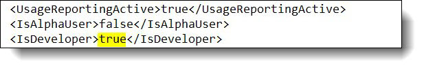 - 将开发人员行设置为true:<IsDeveloper> true </ IsDeveloper>(如果看不到此行,请将其添加)