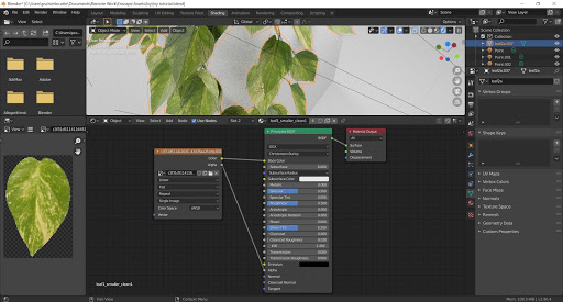 应用于叶子的材质着色器。请注意,使用了透明的.png。为了使透明度在Blender中起作用,必须将图像的alpha输出套接字连接到Principled BSDF着色器的alpha输入节点。