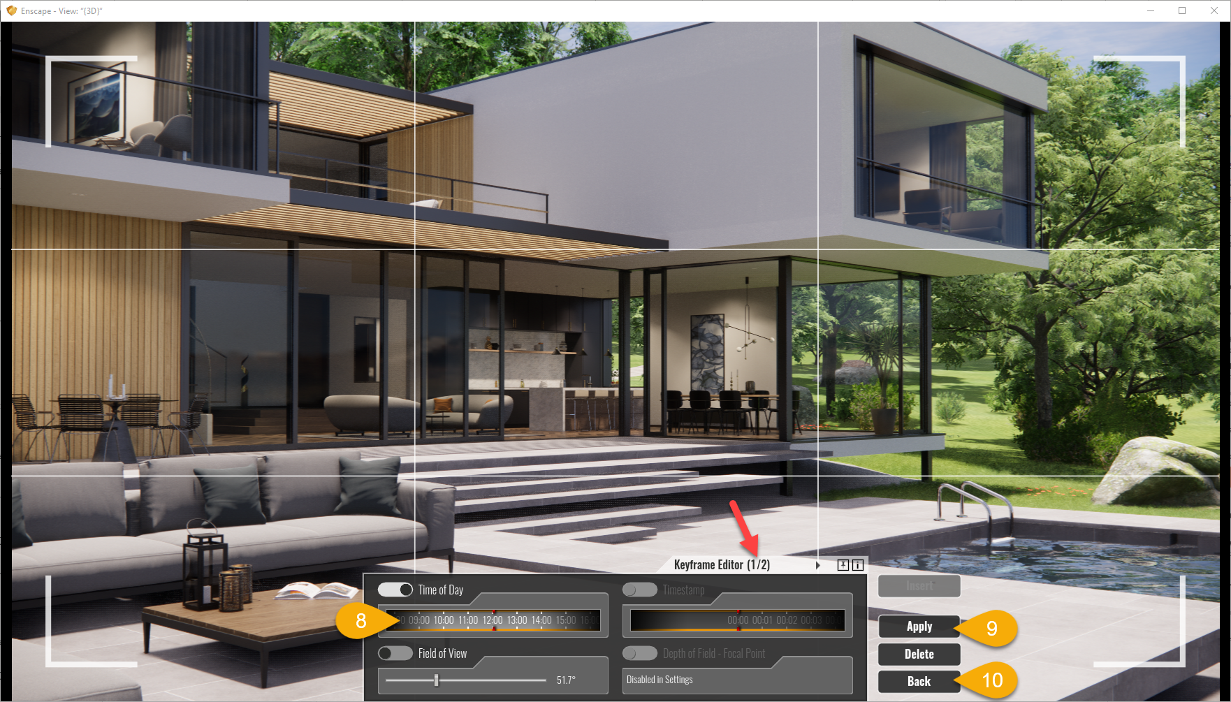 对于设置了开始时间(#8)的关键帧#1,单击“应用”(#9),然后单击“上一步”(#10)以退出关键帧编辑器。