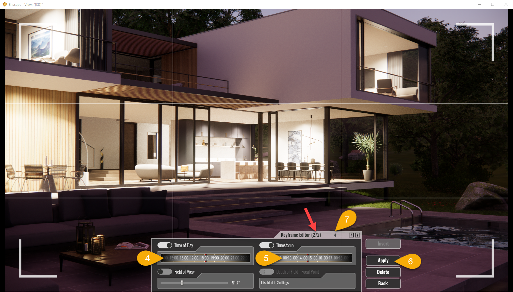 现在,选择视频的结束时间(#4)和持续时间(#5)(请记住,这是针对关键帧#2的)。单击“应用”(#7)