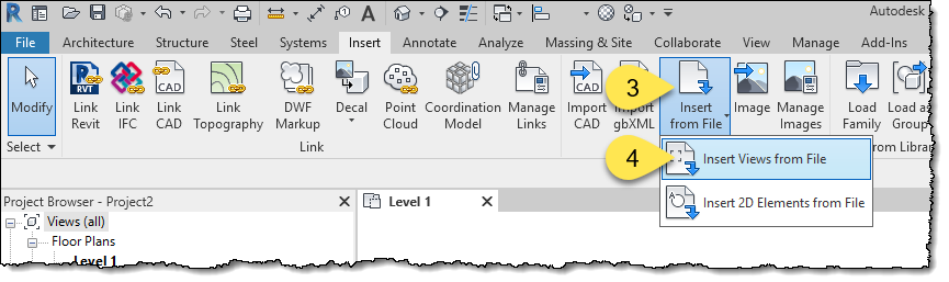 在另一个Revit项目文件中,选择“插入”>“从文件插入”>“从文件插入视图”。