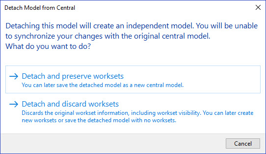 第二种方法是在“打开”对话框中从中央检查“分离”,这意味着该文件当前未打开。结果是您正在使用一个新的中央文件,但当前未保存到任何驱动器。此文件已重置所有工作集和元素权限。旁注:在此过程中,系统将询问您是否应保留工作集,如下图所示。除非有充分的理由,否则始终保留工作集(即,选择顶部选项)。您很有可能会破坏由工作集控制元素可见性的视图的视觉保真度。这是避免使用工作集控制可见性的一个很好的理由。在这里阅读我的“两美分”:避免使用工作集来控制可见性。